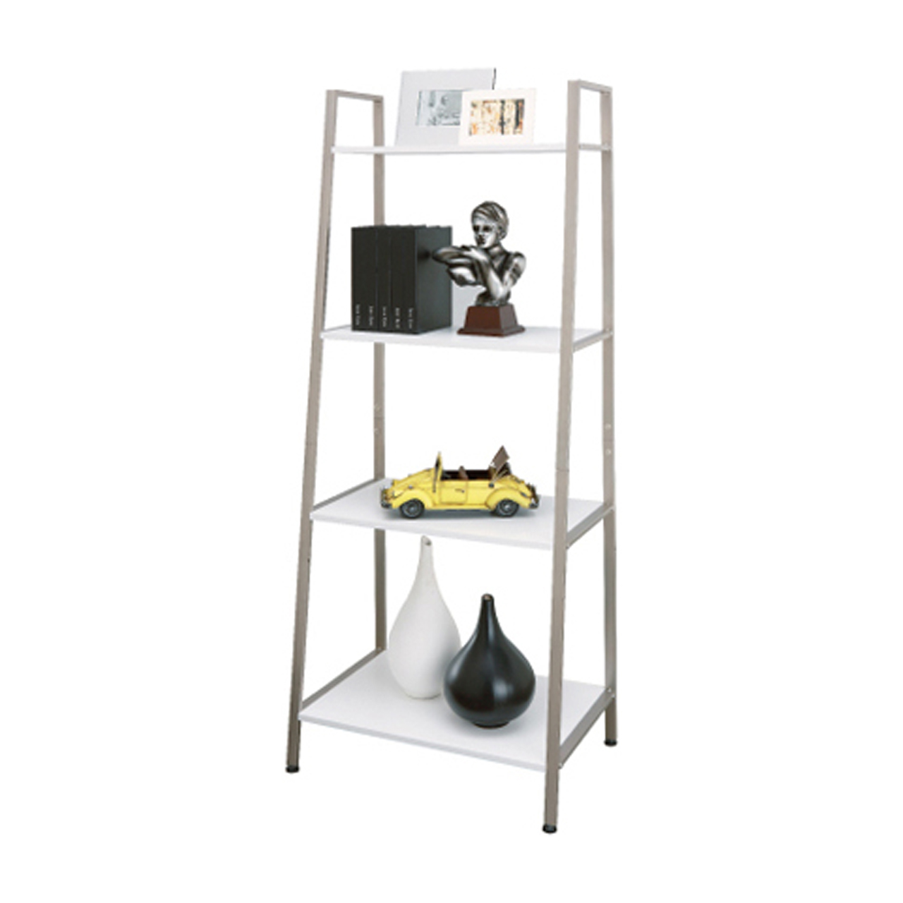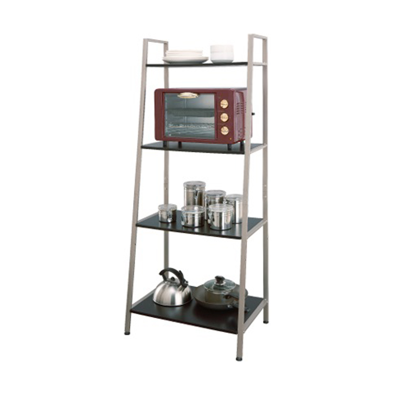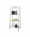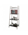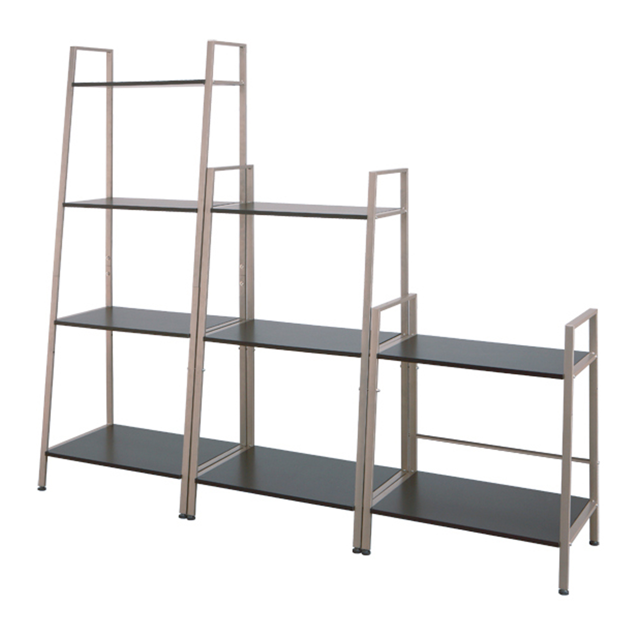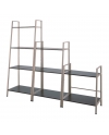 A fusion between metall and wood. This rack had wooden boards that act as the surface for storage but fitted with champagne colored metallic frames to support the structure. The shelf's design is slanted with the bottom tier bigger than the top. The idea is that even if the bottom takes up more space with the top being smaller the overall look and feel seems as if the shelf does not take up as much space. Each wooden tier is fixed with four metallic inner threads. Threse inner threads serves to interact with the screws that will be fixing each board to the frame. If the wooden boards are directly in contact with the screws then in the long run the fixation will become loose and the entire shelf will become less stable, therefore it is important to have these metallic inner thread. Each leg can be adjusted to balance the shelf against the floor.