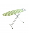 The board is full metallic with mesh pattern. Metal is a good heat tranducer so that while ironing heat does not build up on the board causing potential damages. The cover pad is made of needle punched cotton and it is better than sponge because prolong exposure to heat can cause sponges to deteriorate and become powdery, but cotton does not. Also cotton is more resistant to pressure than sponge preventing the mesh pattern of the board to develop on clothing that are being ironed. Although the majority of ironing boards are height adjustable it is important how the mechanism works. Simple lock by friction is potentially dangerous because if the lock was to slip then the whole ironing board will collapse. This model of ironing board uitlizes a hook and lock mechanism that physically locks each position in place preventing the possiblity of collapsing.