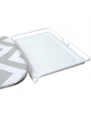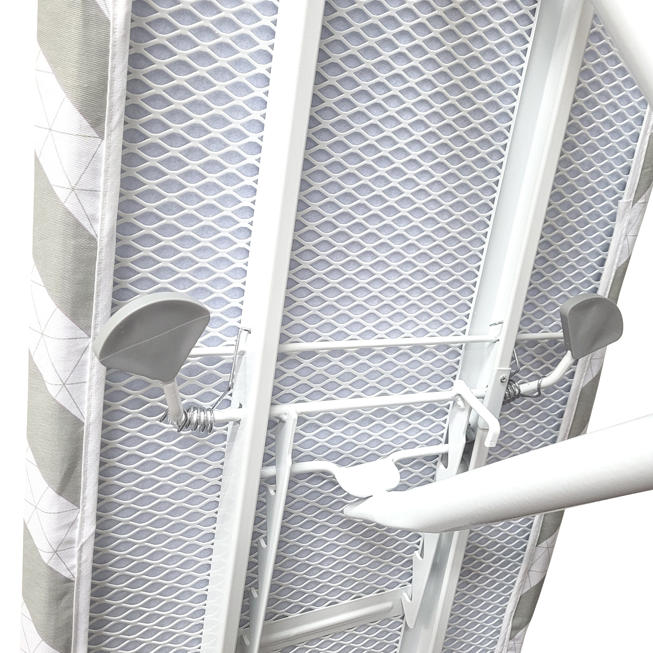 An extra large ironing board that can hold a wider variety of garments. Larger surface means that users will need to turn over garments less making the process swifter and easier. The iron rest of this ironing board is very sturdy and compatible with most steam generators. The iron rest can also be use to hold hangers. To match the quality of this ironing board the cover pad is also extra tough and thick for longer lasting usage and smoother ironing. This ironing board has various position each with a lock to hold it in place. In order to support the weight and sturdiness of this ironing board the legs are thick and strong.